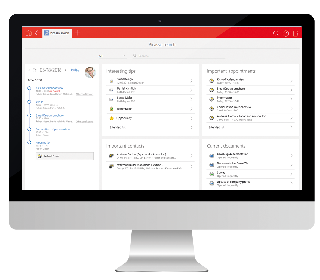 Pe baza acțiunilor dvs. individuale, căutarea Picasso bazată pe inteligență artificială prezintă documentele, întâlnirile și contactele într-o imagine de ansamblu clar structurată.